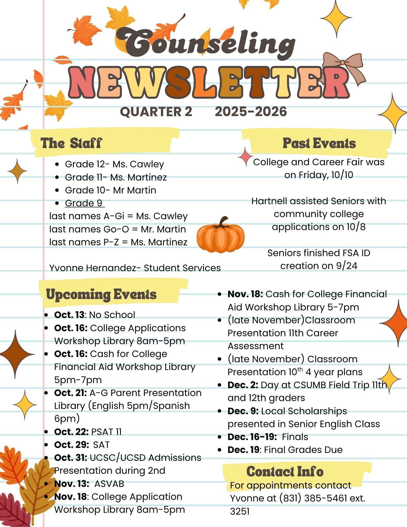 Parents and students can contact their counselor directly with questions. To set up an appointment, please contact Yvonne Hernandez at (831) 385-5461 or [email protected]. We can meet with you in person, by phone call, or by video call. Students, if you would like to schedule a virtual appointment to meet with your counselor feel free to email or use the chat function on Teams.
