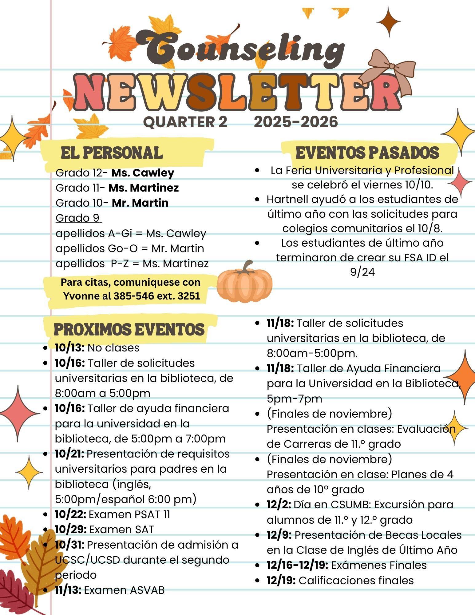 Los padres y los estudiantes pueden comunicarse directamente con su consejero/a si tienen preguntas. Para hacer una cita, comuníquese con Yvonne Hernandez al (831) 385-5461 o [email protected]. Podemos reunirnos con usted en persona, por llamada telefónica o videollamada.